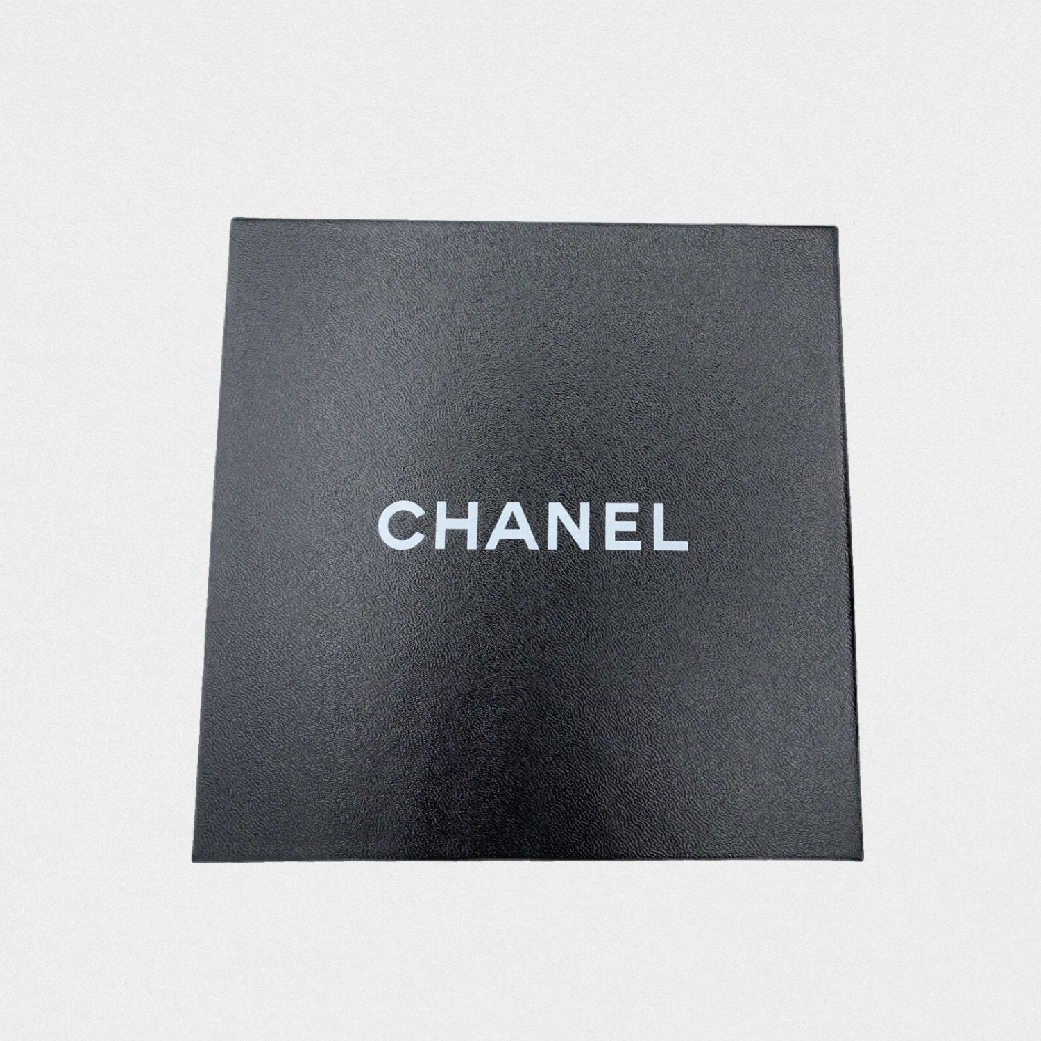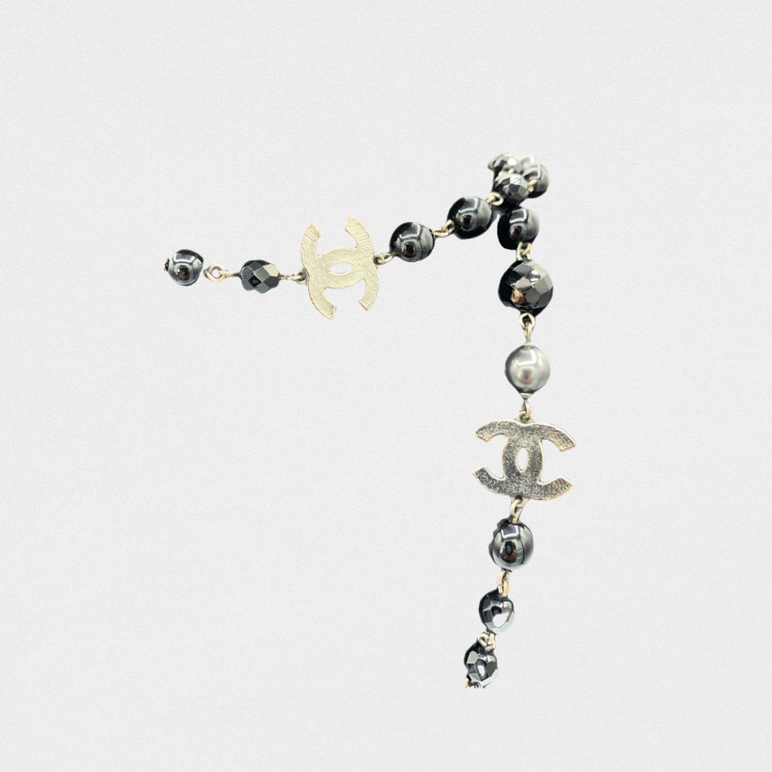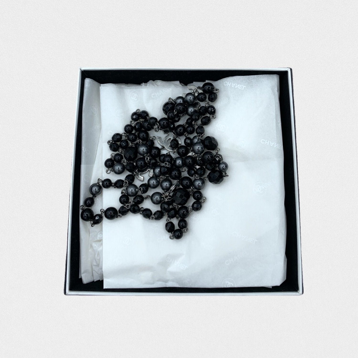 DESCRIPTION: Chanel black long necklace embellished with CC logo