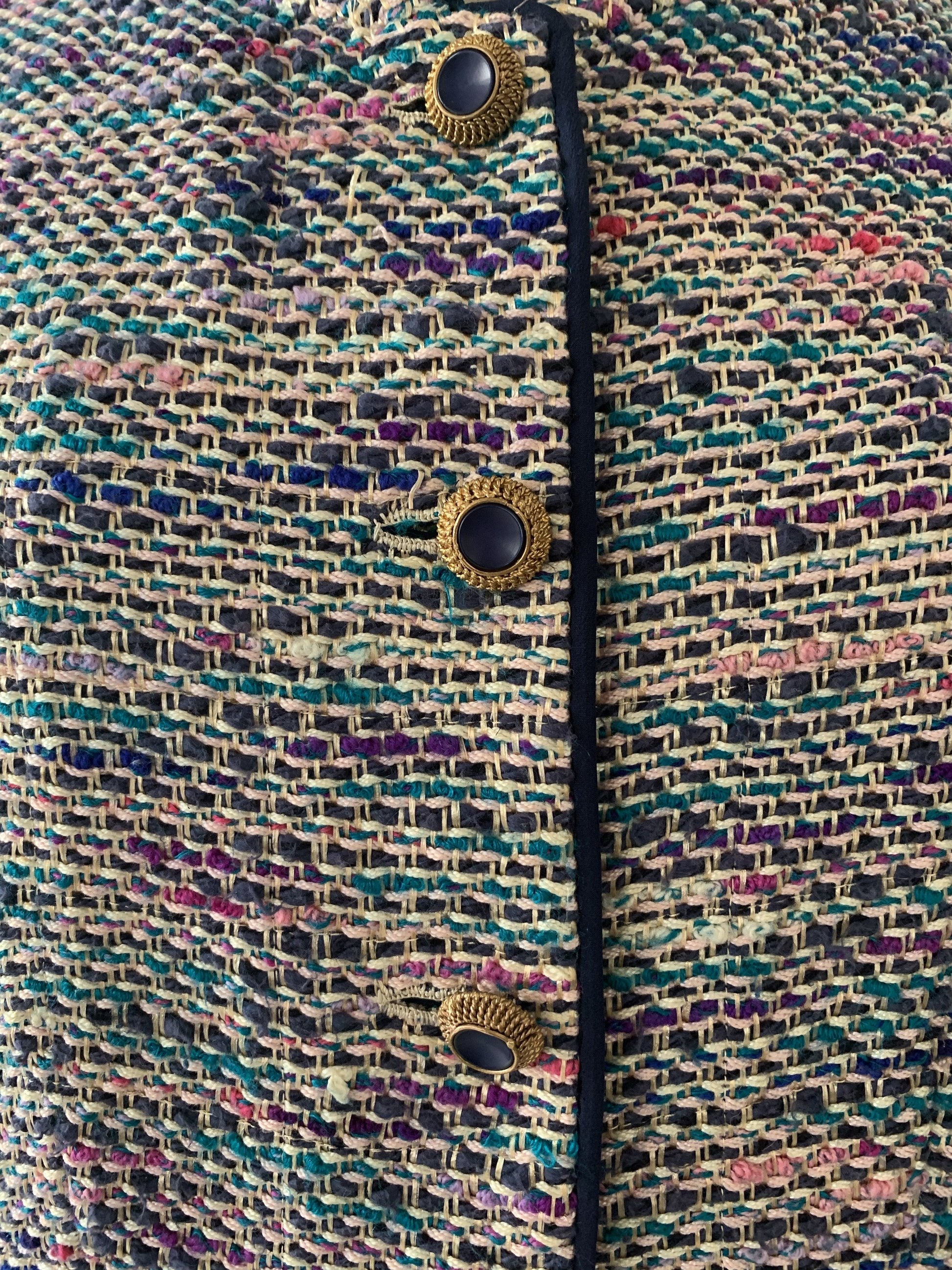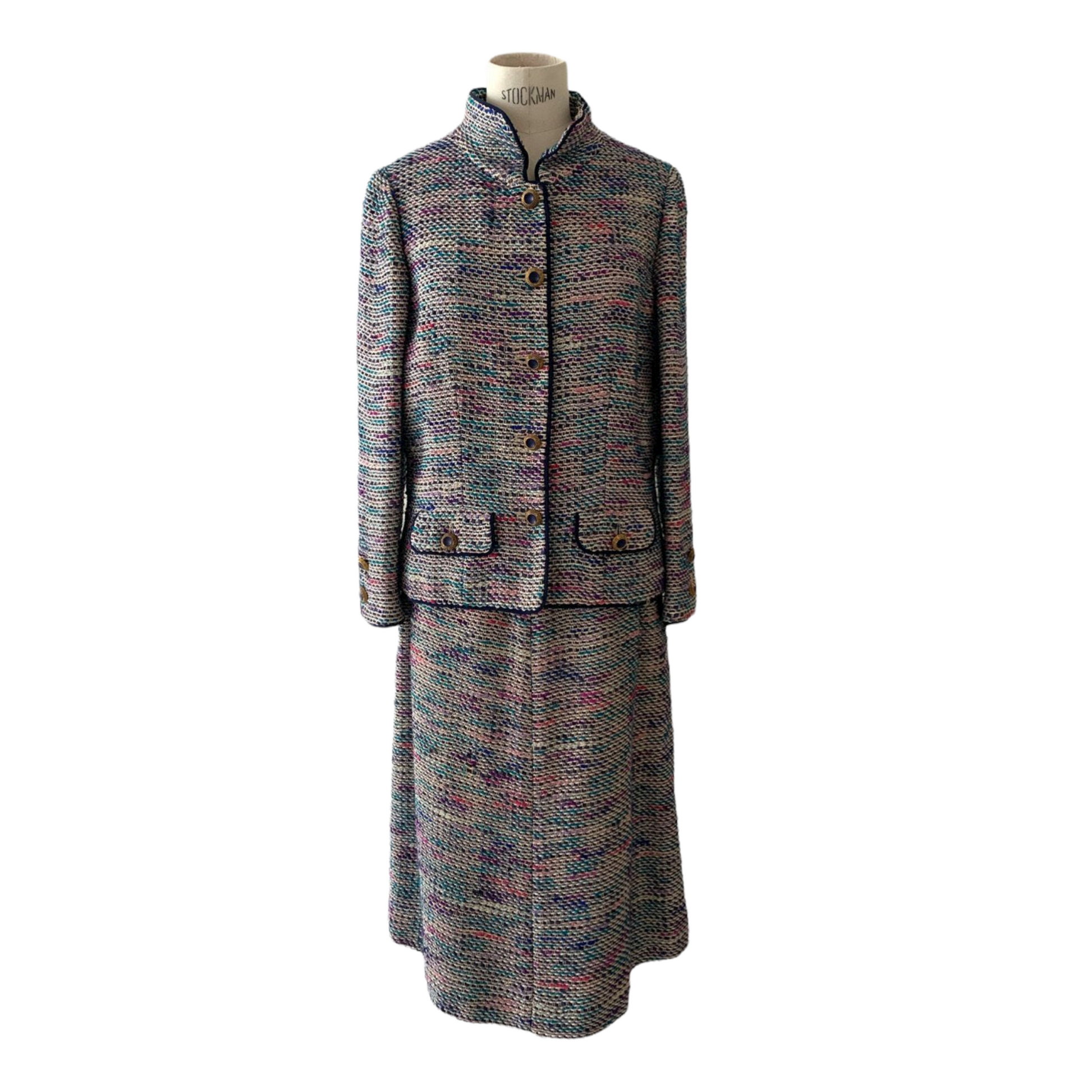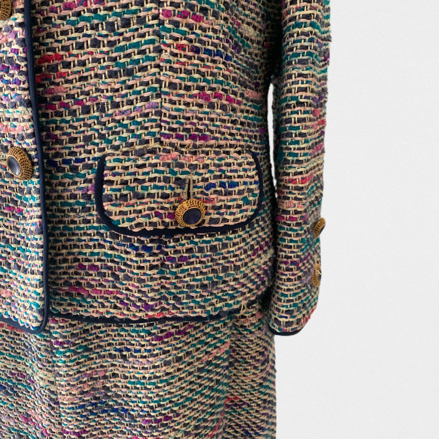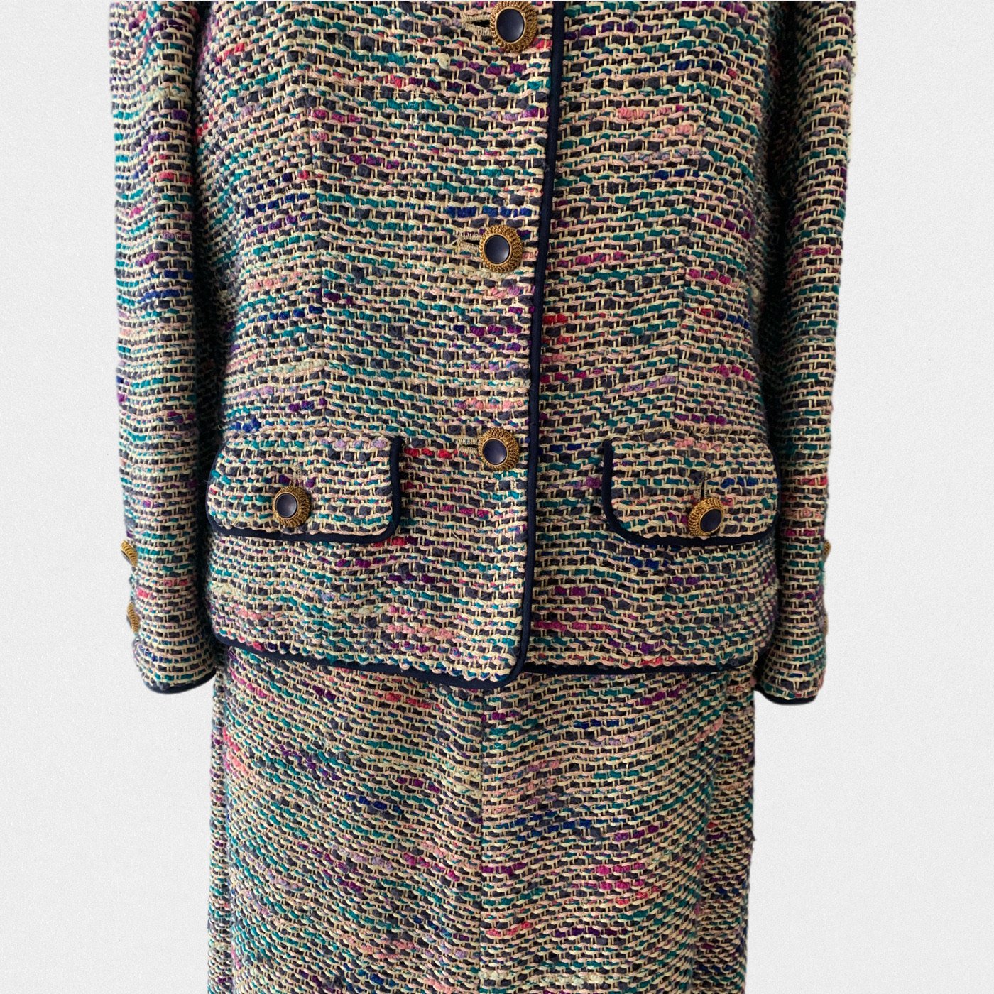 DESCRIPTION: Chanel suit from 1974 - Jacket opening with gold and blue jewelry buttons - Skirt opening with a zip