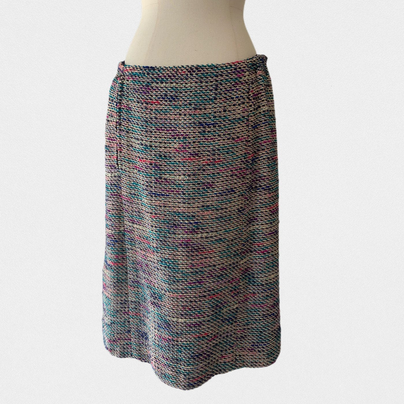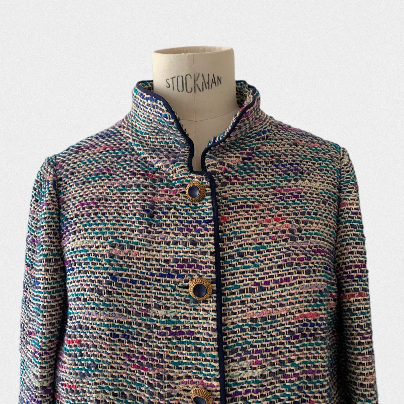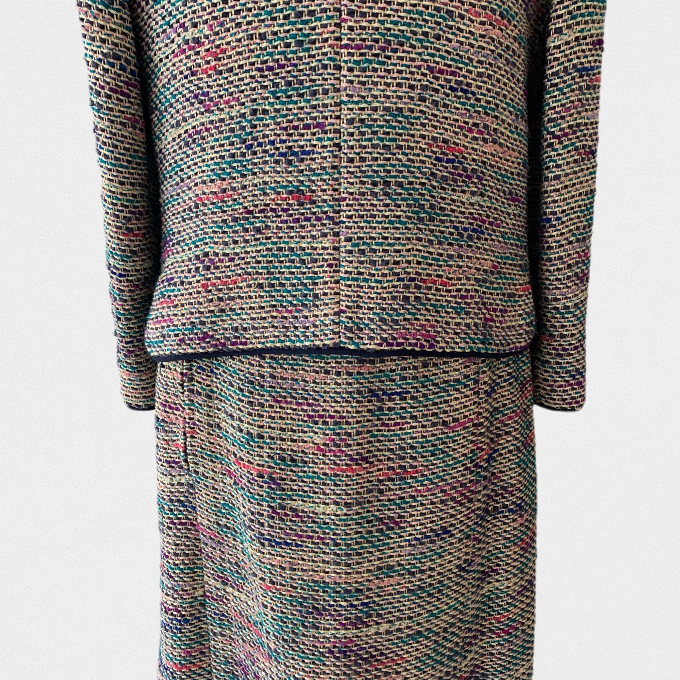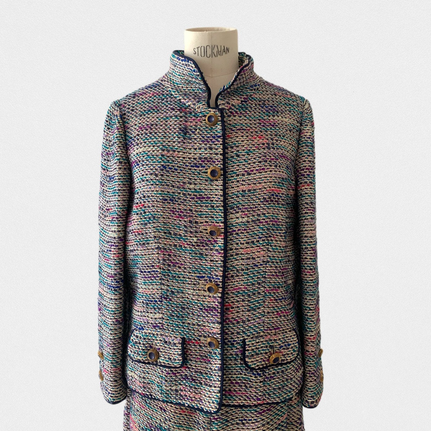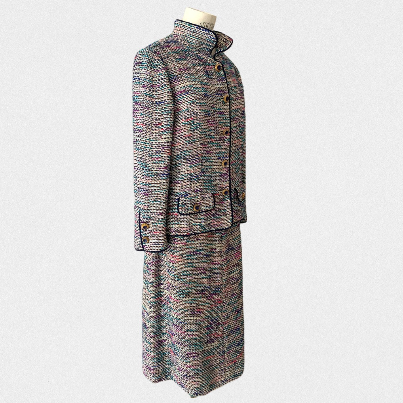 DESCRIPTION: Chanel suit from 1974 - Jacket opening with gold and blue jewelry buttons - Skirt opening with a zip