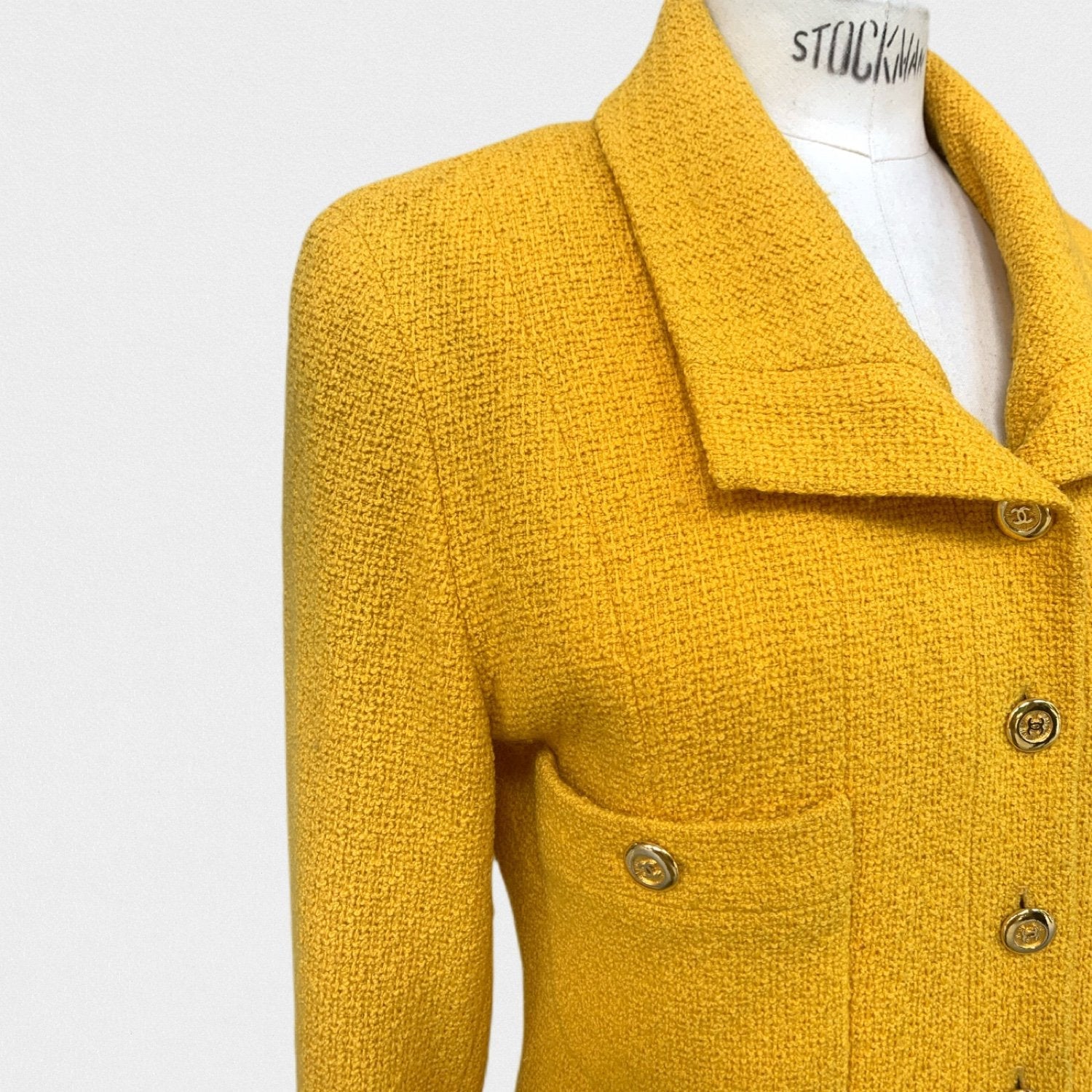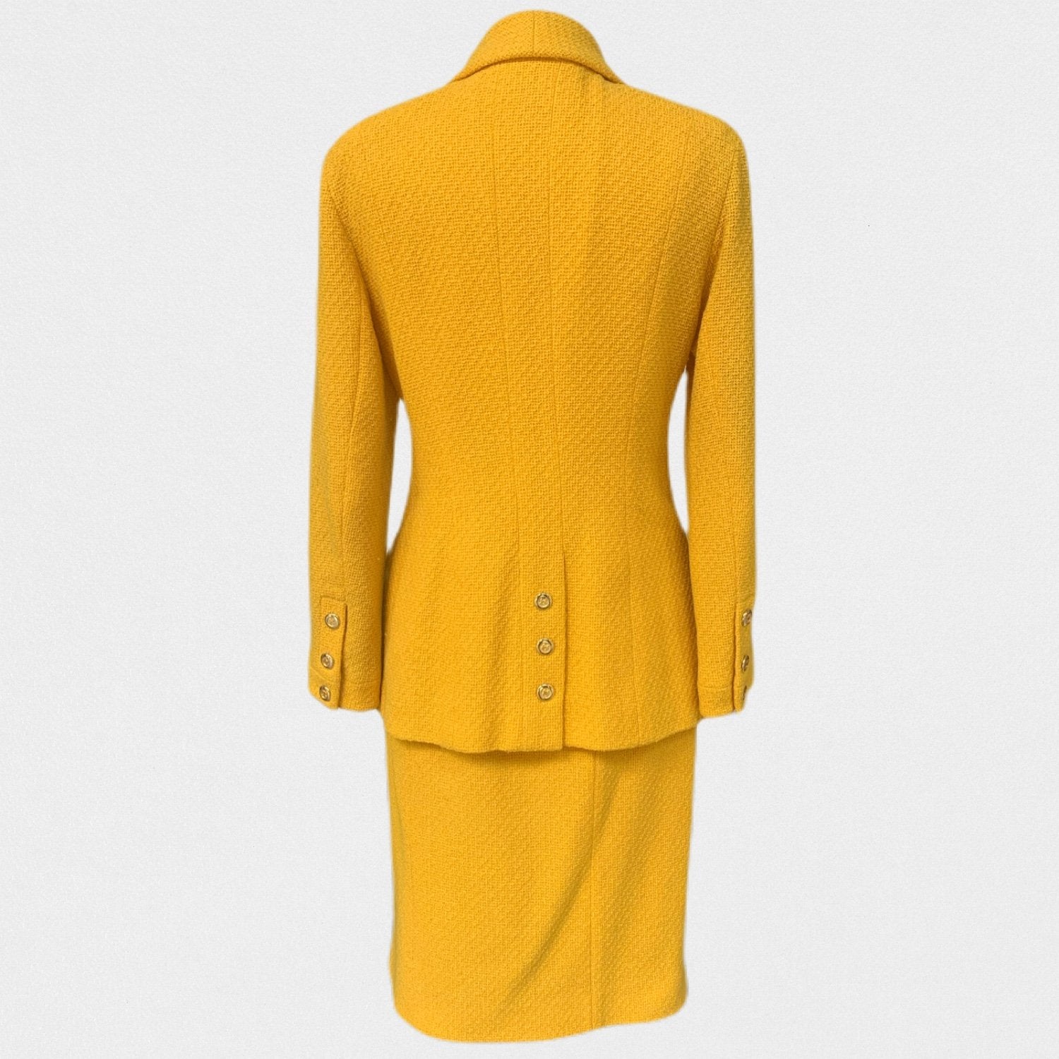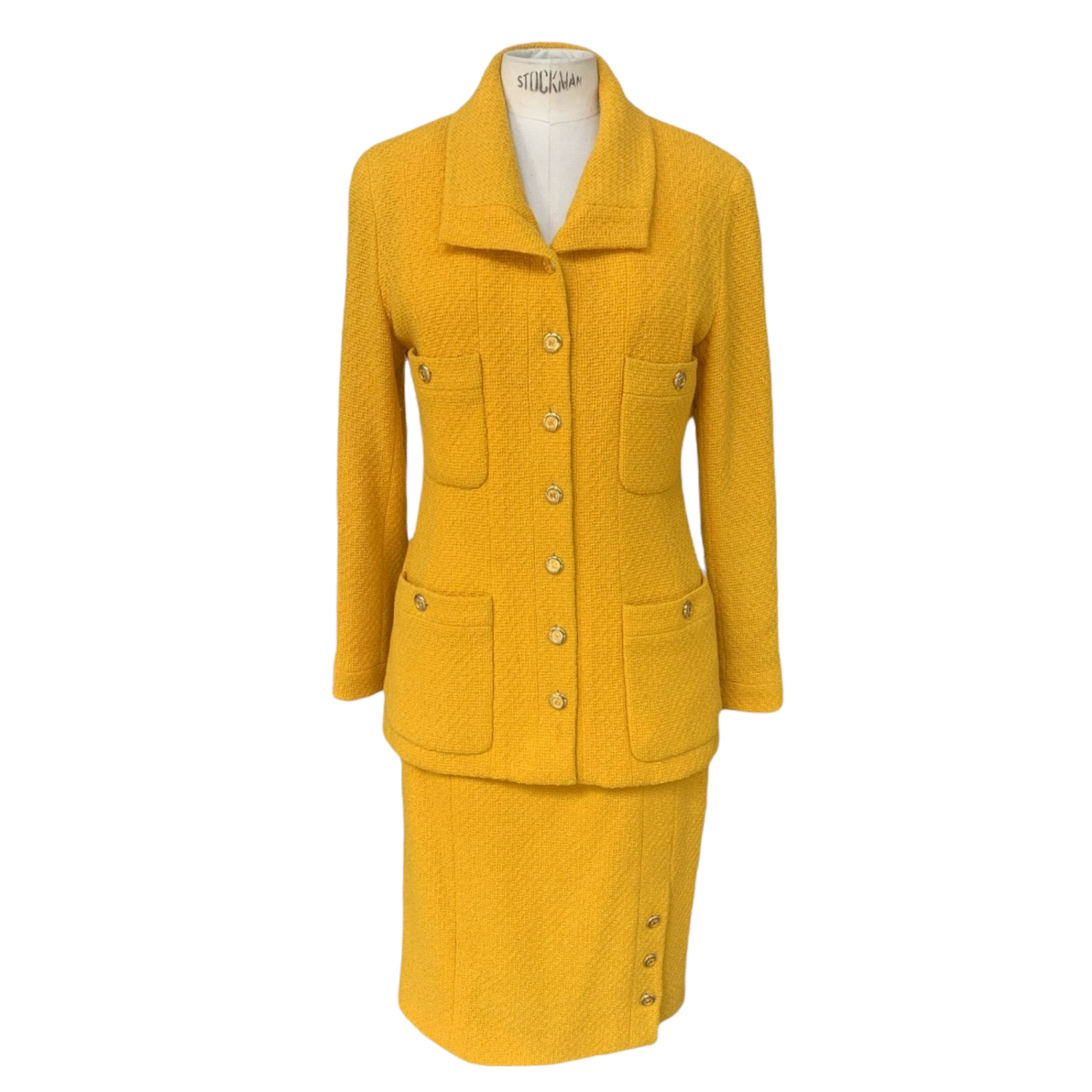 DESCRIPTION: Chanel suit -4 patch pockets on the jacket - Wrap skirt with CC logo button opening - Opening withGold metal buttons with CC logos