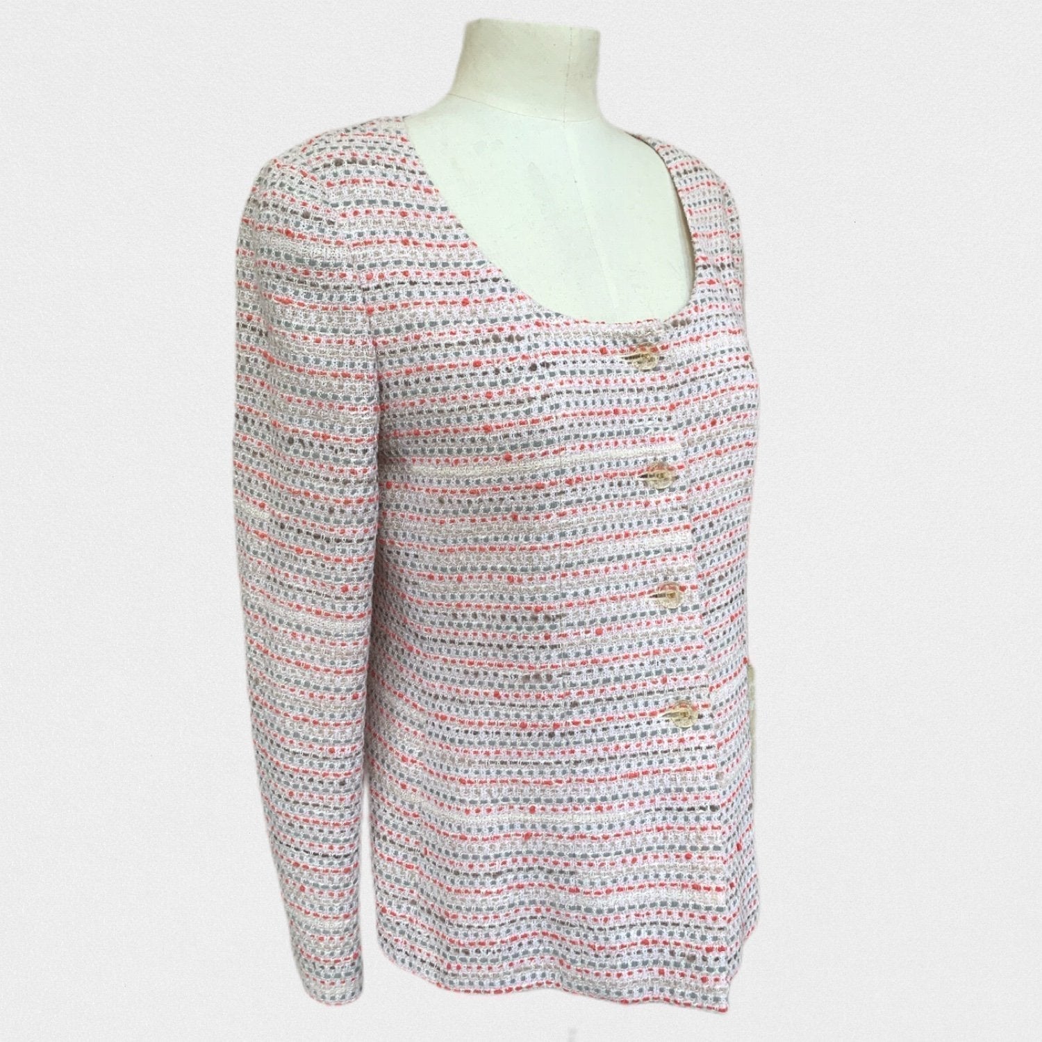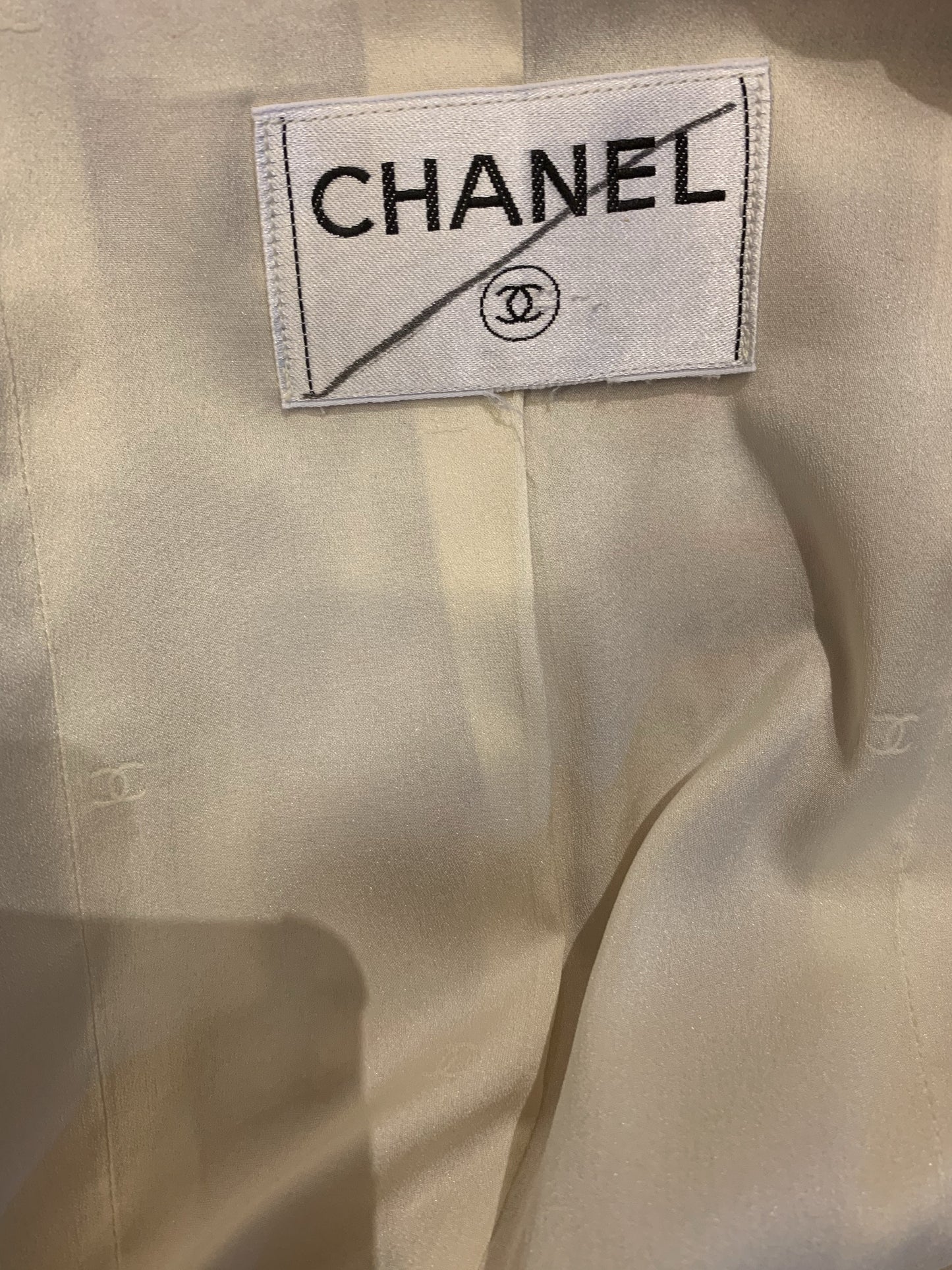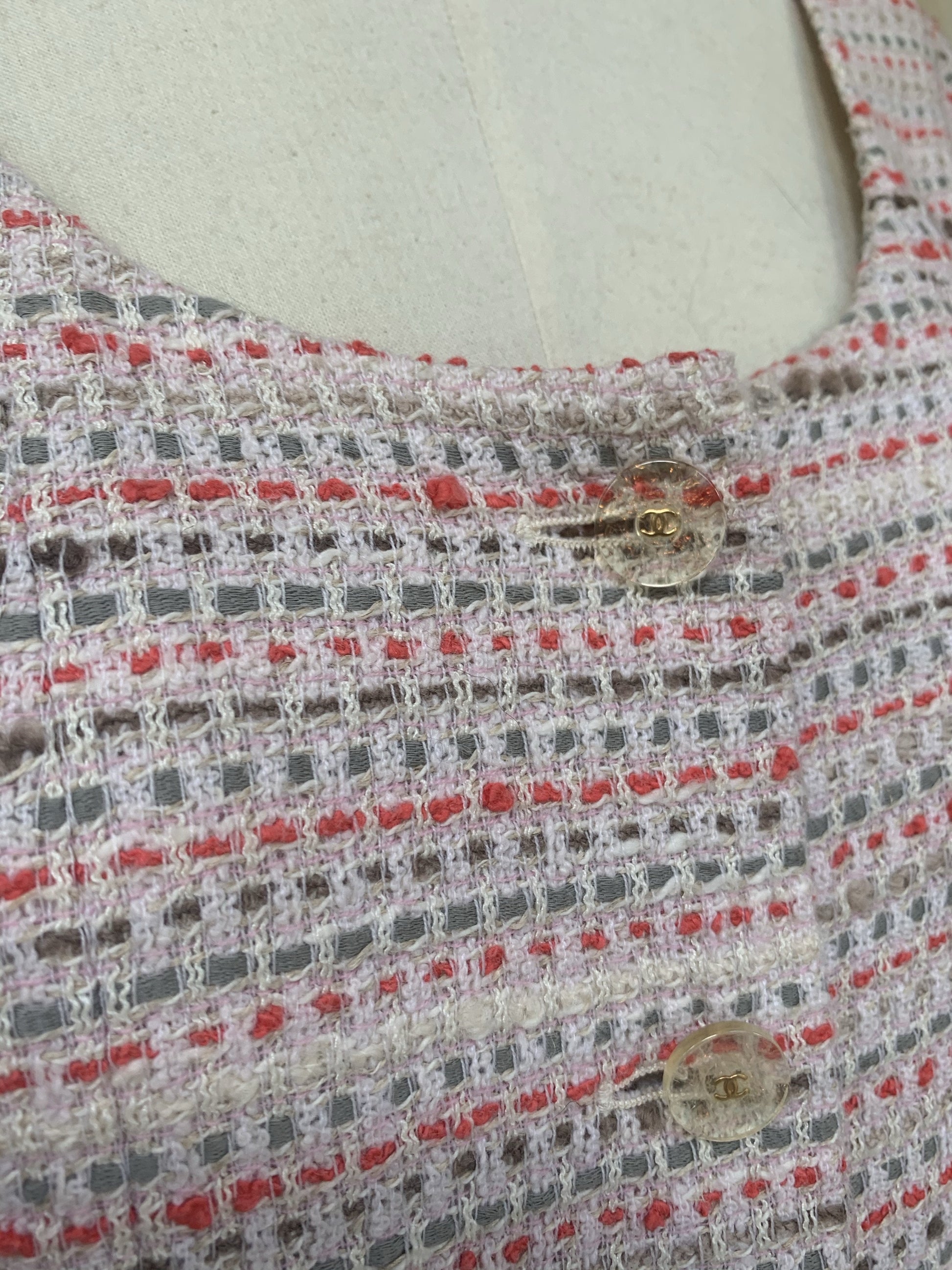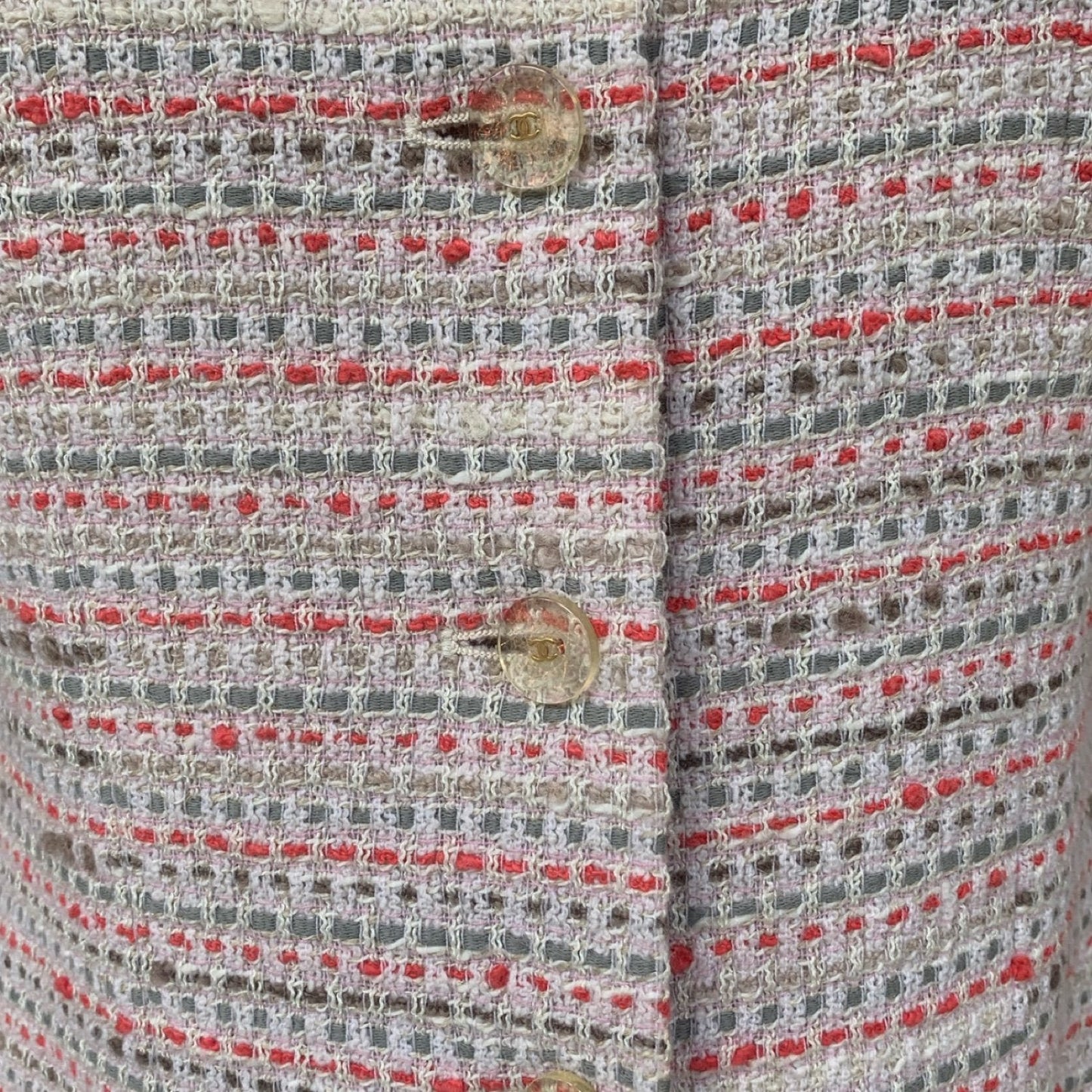 DESCRIPTION: Chanel suit -Opening with transparent resin buttons with gold details and CC logo