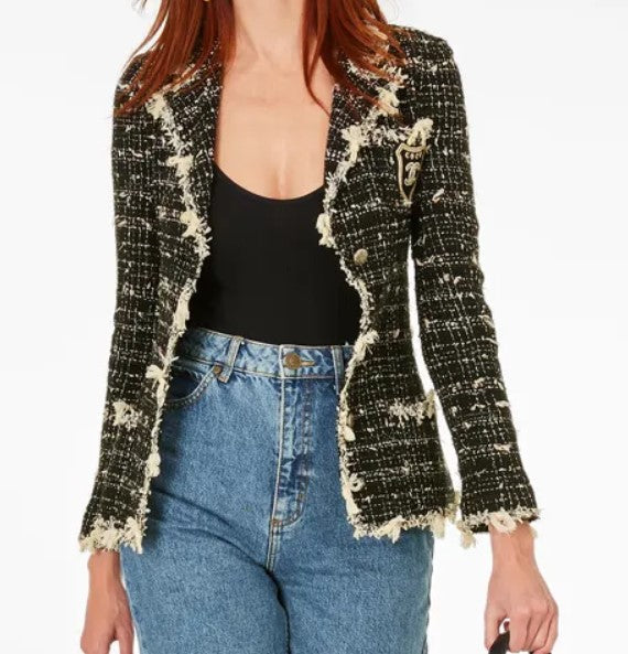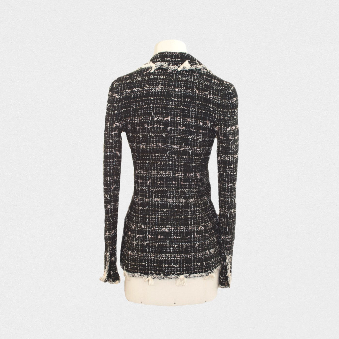DESCRIPTION: Chanel tweed jacket from Cruise 2005. Featuring small cream bows, two patch pockets, Coco Chanel badge